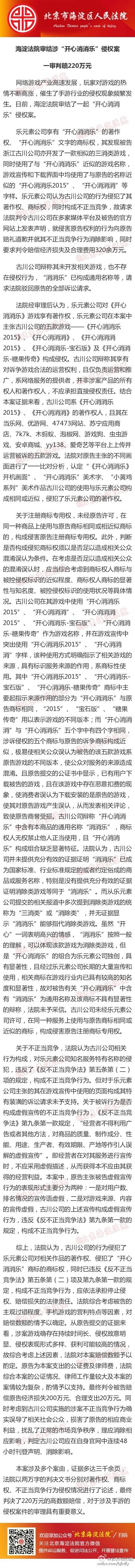 海淀法院审结涉“开心消消乐”侵权案 一审判赔220万元