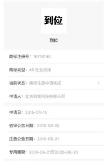 2015年4月,北京邻家科技向国家商标局申请了分类为社会服务的“到位”商标,并在2016年7月26日完成了“社会服务”(商标国际分类号45)商标注册。