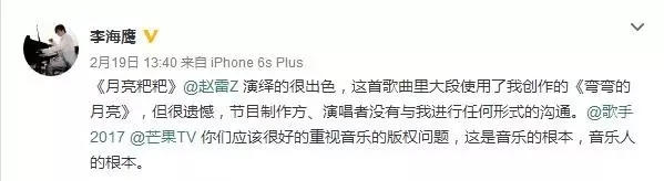 湖南卫视《歌手》节目又涉嫌侵权:《月亮粑粑》引用《弯弯的月亮》未经授权继迪玛希演唱《歌剧2》被维塔斯发出侵权警告、张杰翻唱《默》被高晓松指出未经授权后,湖南卫视《歌手》节目再一次未经授权使用他人音乐作品。词曲作者李海鹰连续发文指责湖南卫视《歌手》节目侵权。李海鹰称:“《月亮粑粑》@赵雷Z 演绎的很出色,这首歌曲里大段使用了我创作的《弯弯的月亮》,但很遗憾,节目制作方、演唱者没有与我进行任何形式的沟通。@歌手2017 @芒果TV 你们应该很好的重视音乐的版权问题,这是音乐的根本,音乐人的根本。”