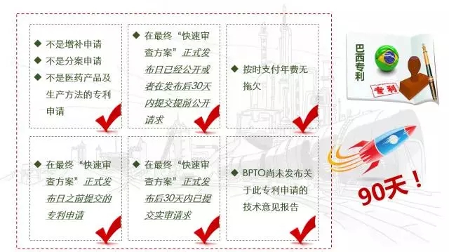 “快速审查方案”草案建议了一个简易流程,根据该草案的规定,如果满足一定的条件,那么该巴西专利申请将无需实质审查在90天内即可被授予专利权。