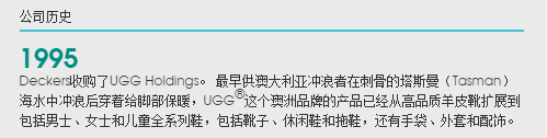 同年,DC公司收购UGG控股公司,使UGG AUSTRALIA成为DC公司旗下的子品牌。通过美国知名女主持人奥普拉·亨弗瑞和好莱坞女明星的宣传推广,UGG AUSTRALIA迅速走红美国,并获得各国消费者的认可。
