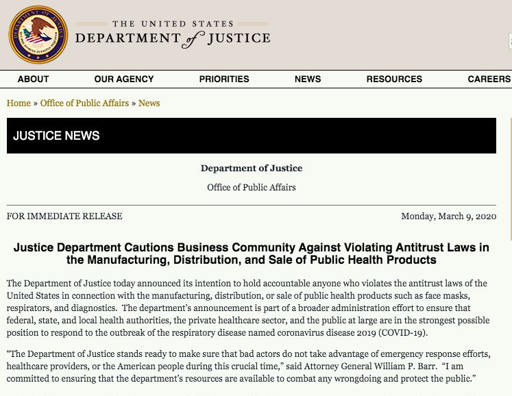 南都记者注意到,美国司法部3月9日发文警告,在制造、分销和销售口罩、呼吸器和诊断设备时,不得违反反垄断法规定,出现固定价格、串通投标、划分销售市场等反竞争行为。个人或公司如果操控口罩、无菌手套等价格,可能面临刑事起诉。