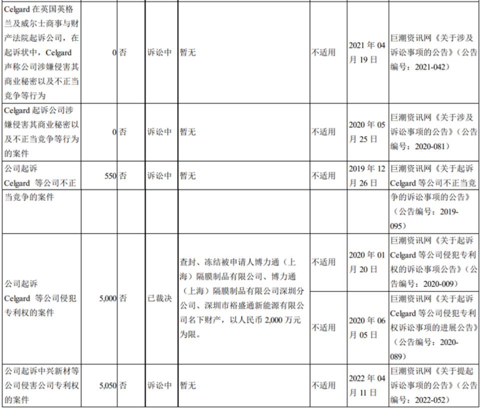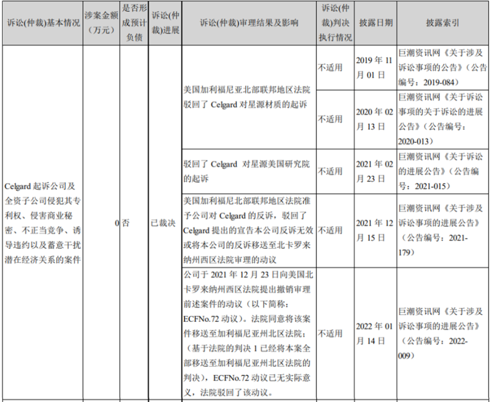 在2022年星源材质的半年报中,清楚的披露了双方之间的知识产权纠纷情况。