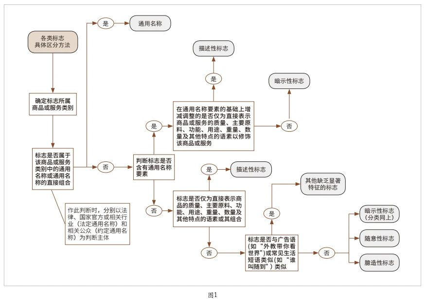 结合相关案例,本文认为,描述性标志和暗示性标志的区分标准为:在通用名称要素的基础上增减调整的仅为表示商品的质量、主要原料、功能、用途、重量、数量及其他特点的语素的为描述性商标,其他一般应认定为暗示性商标。以此可提出各类标志“具体区分方法”(见图1)。
