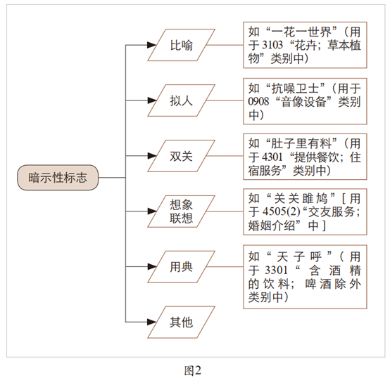 商标因实际使用的需要,所能承载的文字数量有限,实践中一般为一至六个字。基于载体容量的有限性,并非所有表达手法和修辞手法都能用于构造商标。目前,常用于商标的手法主要可归纳为五类:比喻、拟人、双关、联想想象、用典。使用比喻的商标,如在3103“花卉;草本植物”类别中注册的“一花一世界”,将一朵花比作整个世界,展示了微观个体折射出宏观宇宙的哲思;使用拟人的商标,如在0908“音像设备”类别中注册“抗噪卫士”[16],将设备比作抵抗噪音的守卫,生动形象;使用双关的商标,如在4301“提供餐饮;住宿服务”类别中注册“肚子里有料”[17],既指口腹得到满足,肚中无饥馁,又指胸藏文墨,确有真才实学,一语双关,趣味横生;使用联想想象的商标,如在4505(2)“交友服务;婚姻介绍”类别中注册“关关雎鸠”,以雎鸠鸟“生有定偶而不相乱,偶常并游而不相狎”的用情专一,联想想象到世间有情人,从而引人回味、启人遐思;使用用典的商标,如在3301“含酒精的饮料;啤酒除外”类别中注册“天子呼”,引用诗仙李白“天子呼来不上船,自称臣是酒中仙”之典故,给人以富贵于我如浮云、惟愿诗酒度此生的洒脱不羁之感。可见,暗示性标志具有得天独厚的、引人入胜的、易于宣传推广的优势(见图2)。
