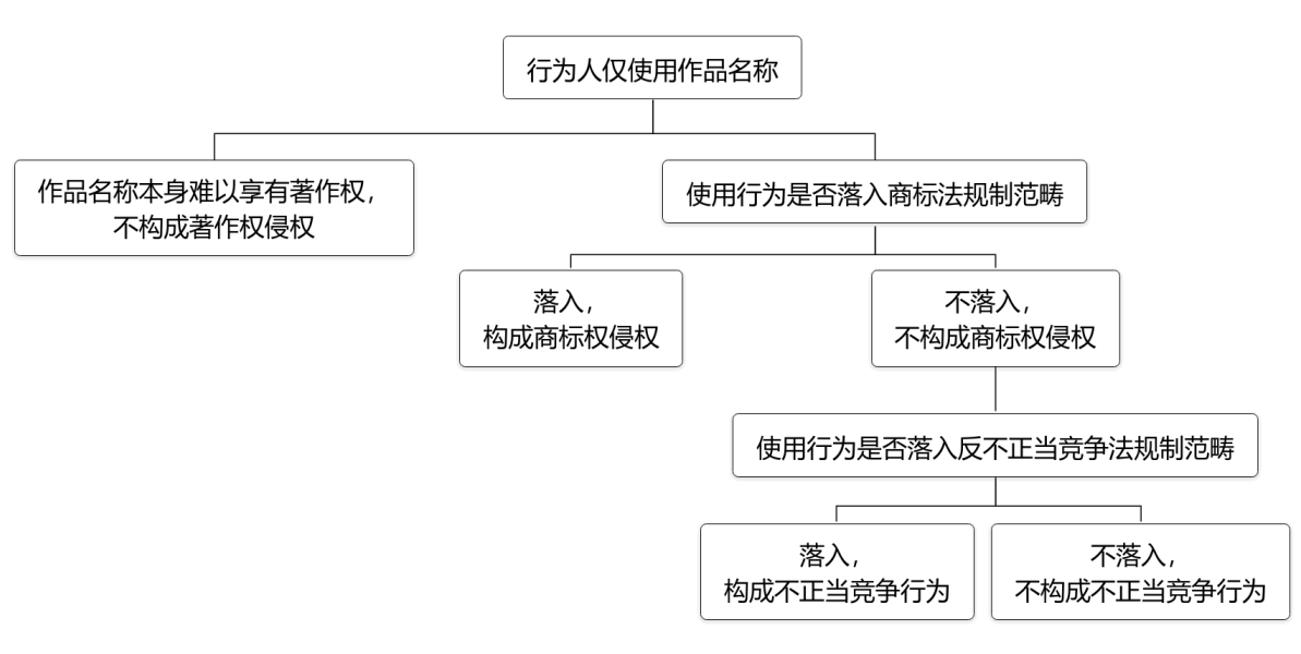 综上,实践中,区分假象侵权行为、认定作品名称侵权行为的具体个数,可以从作品名称使用行为属于商标性使用还是指示性使用的角度出发,通过认定作品名称的使用性质,对在商业活动中使用作品名称是否单独构成商标侵权或不正当竞争行为进行认定,从而明确同时使用作品名称及作品内容时的侵权行为竞合与聚合问题。